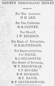 In 1900, JW Dickson was elected sheriff of Lowndes County. At that time, having one’s name on the “County Democratic Ticket” was tantamount to winning. A year later, in October 1901, the public notice in the Hayneville newspaper about the vote to ratify Alabama’s now-infamous state constitution bore Dickson’s name. In subsequent years, various other public notices on everyday legal matters also bear his name, showing him acting as executor of an estate or proclaiming the sale of seized property.