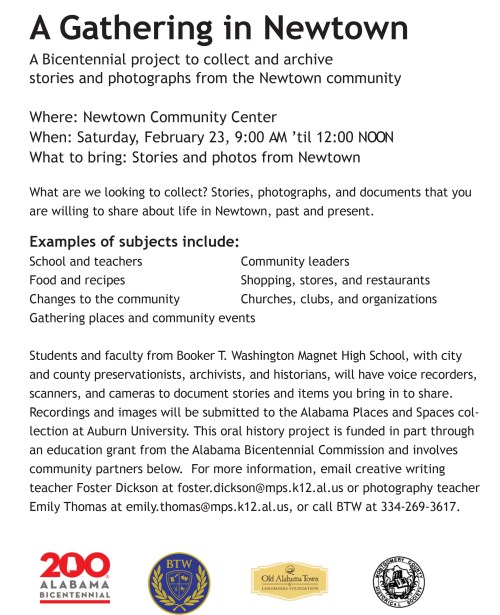 Next Saturday, February 23, my Creative Writing students and students from our school’s Photography magnet will be at the Newtown Community Center in north Montgomery to collect stories and images from the Newtown community. The event will be from 9:00 AM ’til 12:00 noon. The project is funded by an honorable mention grant from the Alabama Bicentennial committee.