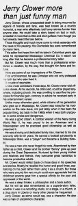 By all accounts, Jerry Clower is remembered fondly because he was just a good guy. Neither during his life nor since his death has news come out to say he was another kind of person behind the scenes. He was a family man who was married to one woman, Homerline, from August 1947 until his death in August 1998; they had four children, a son and three daughters. Those who knew him described him as a Christian man who lived his faith and whose comedy performances could be played in the church and the club alike. His Mississippi persona was not a put-on or a marketing gimmick— he was the real deal. One of the more endearing testimonials that appeared after his death was this unsigned editorial, which ran in several Mississippi newspapers. (You can click on it to enlarge it and read.) The world – the South, in particular – certainly misses him.